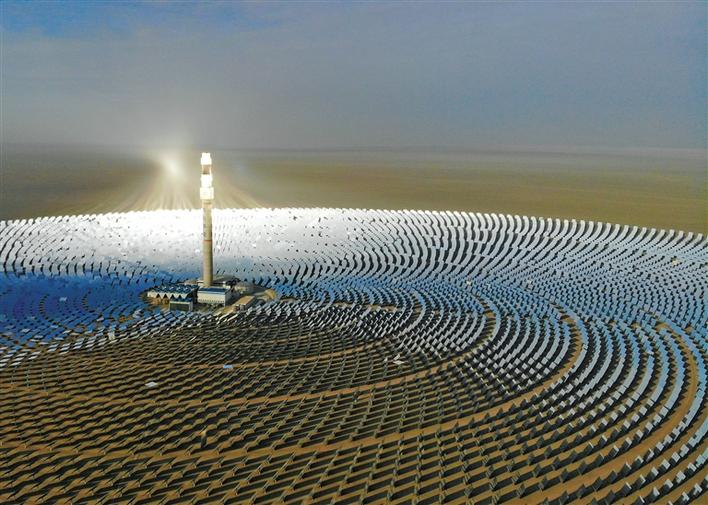 在甘肅省敦煌市向西約20公里處,被稱(chēng)為“超級(jí)鏡子發(fā)電站”的首航高科敦煌100兆瓦熔鹽塔式光熱電站在戈壁灘上閃耀(2021年2月24日攝,無(wú)人機(jī)照片)。新華社記者 馬希平 攝