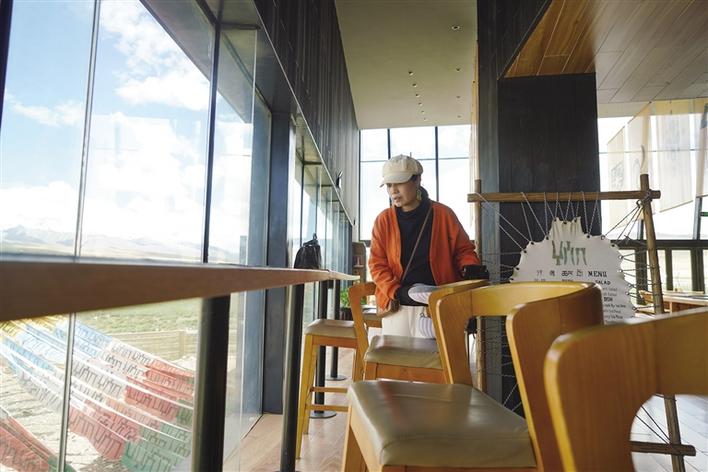 從正門進(jìn)入,穿過牦牛文化空間走廊,便可到能夠以最佳視角欣賞念青唐古拉山的VR觀景臺。緊鄰觀景臺右側(cè),是一間擺放當(dāng)?shù)匚膭?chuàng)產(chǎn)品、各類書籍的觀景咖啡廳。該咖啡廳的兩面墻體設(shè)計為超大落地窗,在此休息的游客可以邊品嘗咖啡,邊欣賞念青唐古拉山及拉多草原的美景。走進(jìn)咖啡廳,記者看到不少在這里休息的游客都在低頭寫著什么,經(jīng)咖啡廳負(fù)責(zé)人介紹:“這些游客是在寫明信片,我們這里不僅提供餐飲,還提供印有本地風(fēng)景的明信片,并同中國郵政合作,幫助游客按時將明信片寄到他們的親朋好友手中,讓游客們的旅途變得更有意義?!?/p>