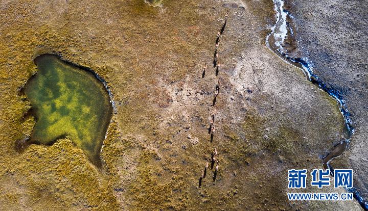 2019年10月19日,藏野驢在三江源地區(qū)活動(無人機照片) 新華社記者 吳剛 攝