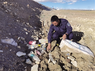 可可西里索南達(dá)杰保護(hù)站工作人員在109國道沿線撿拾被丟棄的垃圾??煽晌骼锕芾硖幑﹫D