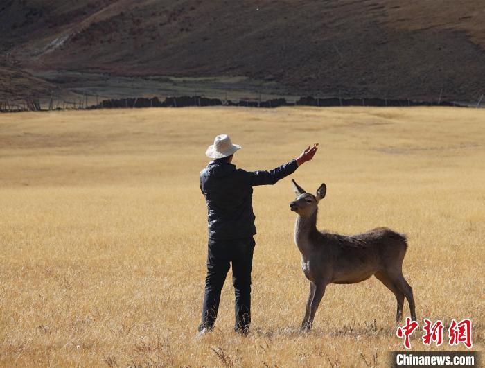 圖為西藏類烏齊馬鹿國家級自然保護區(qū)的管護員正在飼喂馬鹿?!∪轿木?攝