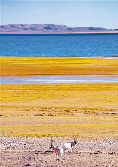 圖為藏羚羊在位于西藏那曲市的色林錯湖畔。