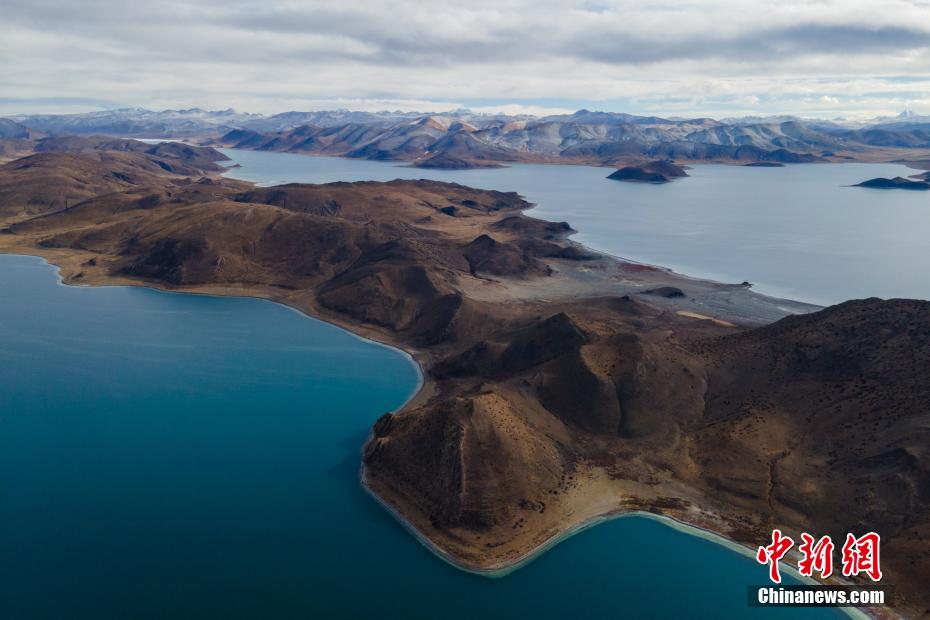 航拍羊卓雍錯(cuò)與遠(yuǎn)處的雪山。 江飛波 攝