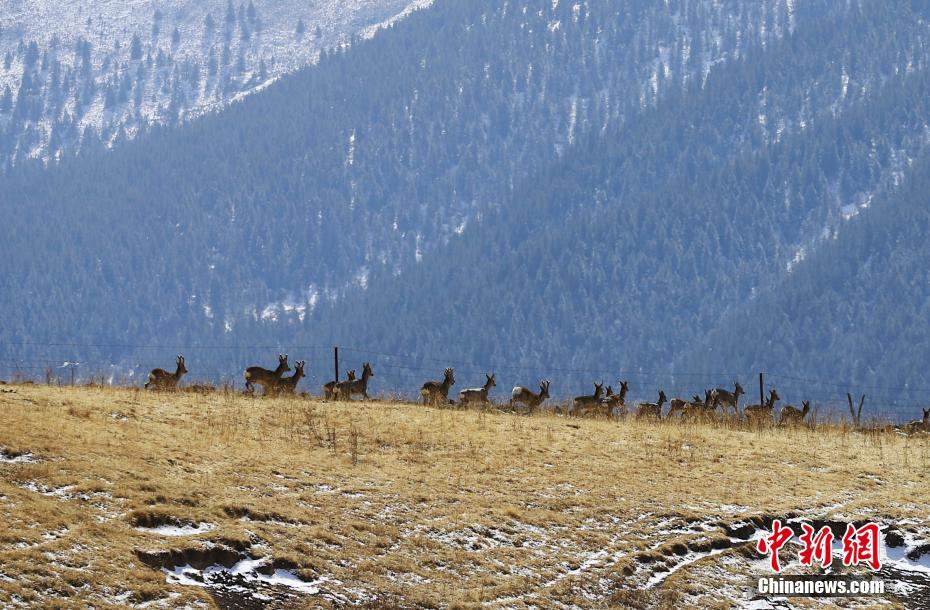 3月16日,成群的矮鹿在青海省海北藏族自治州祁連山國家公園青海片區(qū)草場上嬉戲。祁連山國家公園地處中國青海、甘肅兩省交界,總面積5.02萬平方千米,其中青海片區(qū)1.58萬平方千米。近年來,隨著當(dāng)?shù)厣鷳B(tài)環(huán)境持續(xù)改善,祁連山國家公園青海片區(qū)珍稀野生動物種群數(shù)量不斷增加。 中新社記者 馬銘言 攝