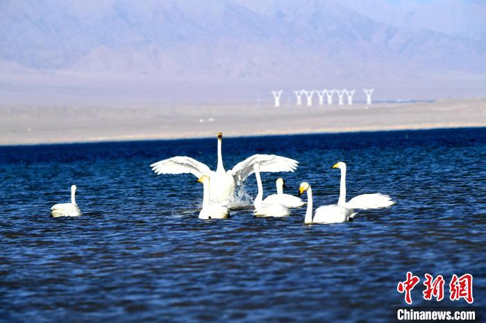 圖為天鵝群在湖中游蕩。 青海多美生態(tài)環(huán)??萍加邢薰?供圖