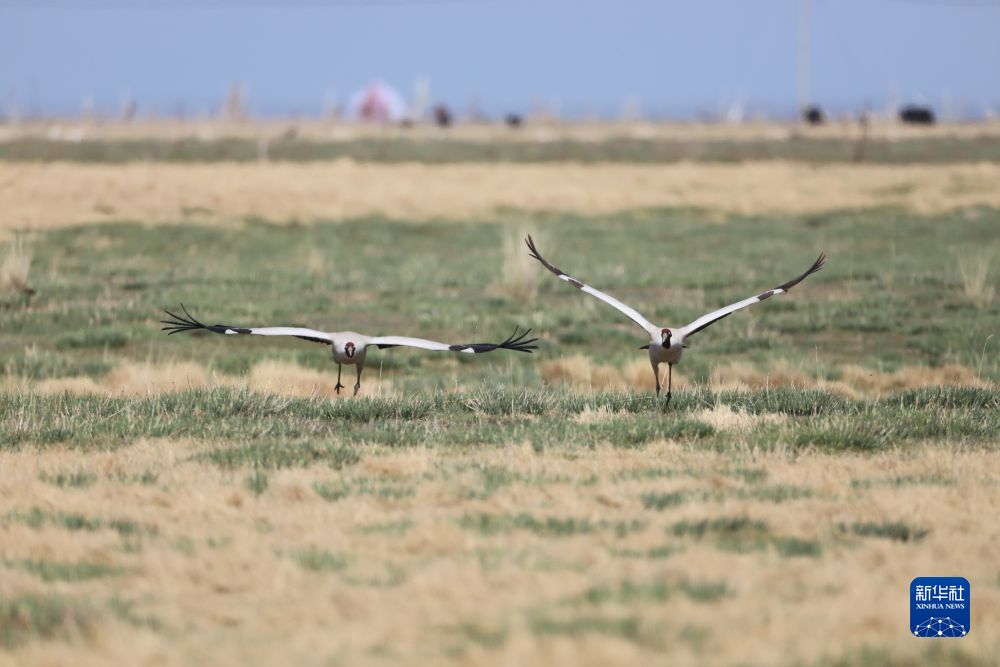 5月23日,在青海省海北藏族自治州剛察縣,青海湖畔的黑頸鶴展翅飛翔。(受訪者供圖)