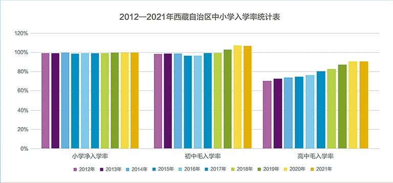 教育事業(yè)成果豐碩。全區(qū)共有各級(jí)各類學(xué)校3339所,在校學(xué)生92萬人。圖為西藏自治區(qū)中小學(xué)入學(xué)率統(tǒng)計(jì)表。