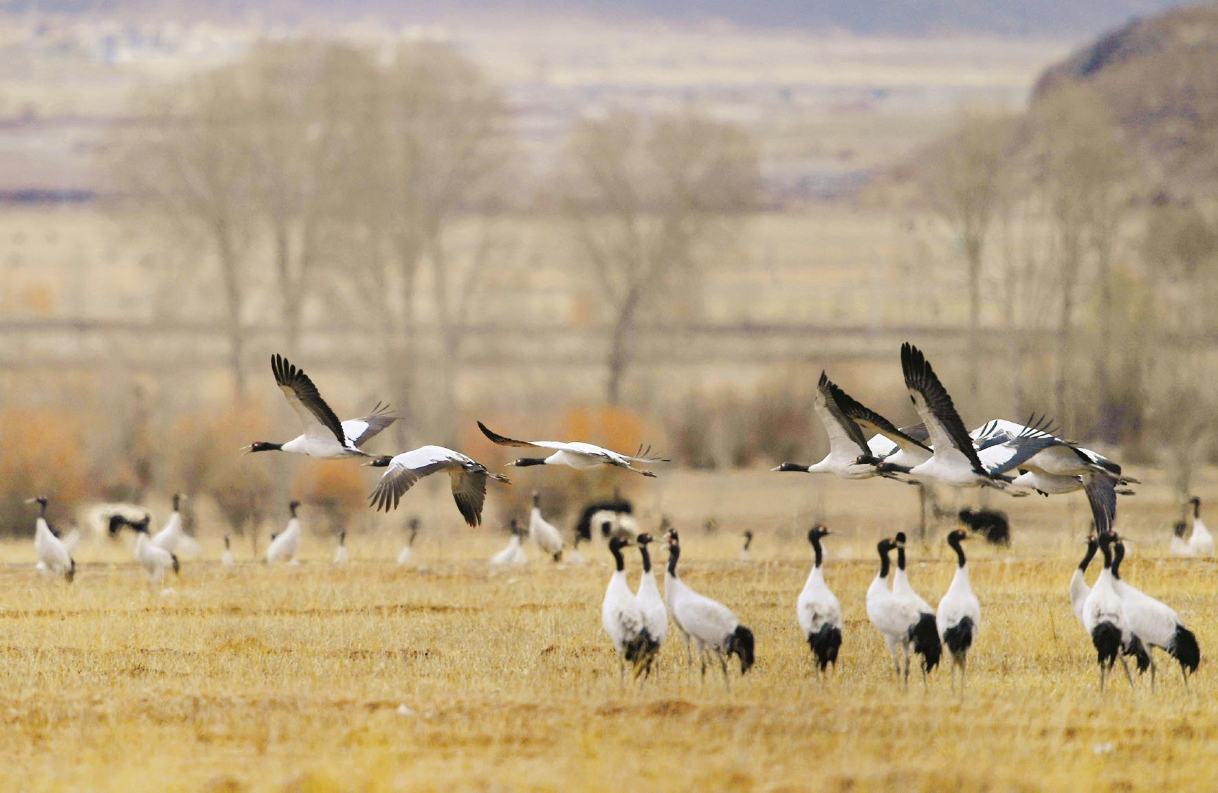 拉薩林周縣位于拉薩河上游及澎波河流域,是雅魯藏布江中游河谷地區(qū)黑頸鶴分布數(shù)量最為集中的保護(hù)區(qū)。黑頸鶴是國家一級保護(hù)動物。目前,每年到林周縣越冬的黑頸鶴已達(dá)2000只左右,林周縣區(qū)域內(nèi)的大片濕地成為黑頸鶴的“冬季樂園”。