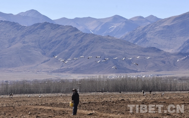 中國(guó)西藏網(wǎng)訊 地處雅魯藏布江中游河谷地帶的西藏自治區(qū)拉薩市林周縣,被稱為拉薩“糧倉(cāng)”。每年的冬季,林周縣虎頭山水庫(kù)因兩面夾山,周邊有大片的良田,成為黑頸鶴覓食、夜棲的佳地。