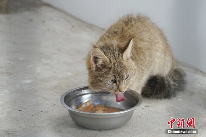圖為1月18日,在青海省祁連山國家公園野生動物救護(hù)繁育站內(nèi),一只荒漠貓正在進(jìn)食。 中新社記者 馬銘言 攝