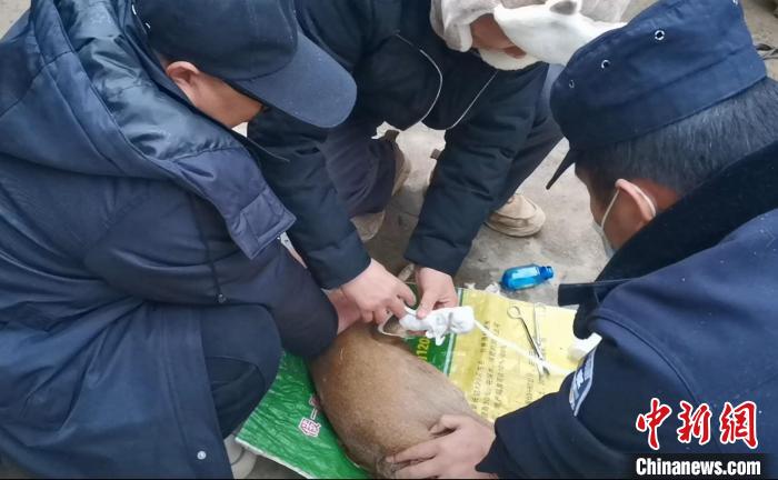 圖為移民管理警察與獸醫(yī)站人員為赤麂包扎傷口?!⌒?yīng)天 攝