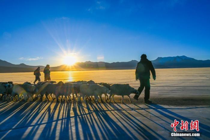 這個(gè)邊境小村3日迎來(lái)了一年一度的“趕羊”盛事。村民們將1400余只羊由岸邊通過(guò)厚實(shí)的冰面趕往湖心島牧場(chǎng)。普姆雍措被稱(chēng)為“仙女之淚”,位于西藏山南市浪卡子縣,每到冬季極寒時(shí),便是羊群轉(zhuǎn)牧場(chǎng)的好時(shí)機(jī)。