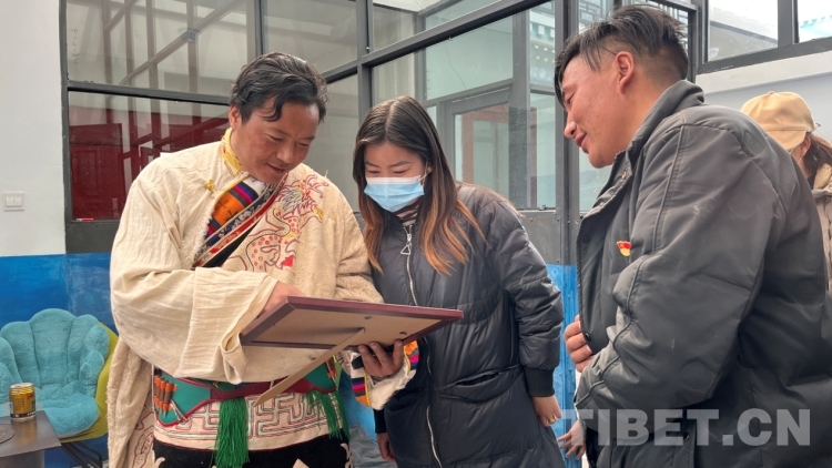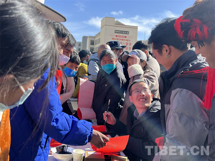 來到送“書法”現(xiàn)場,書法家們早早地來到活動現(xiàn)場,他們準備筆墨、鋪開紙張,為現(xiàn)場群眾書寫藏、漢文新年對聯(lián),“?!弊帧ⅰ凹槿缫狻?、“扎西德勒”等寓意美好的祝福。書法家協(xié)會副主席祖牛拉巴次仁說:“從春節(jié)開始,我們書法家們去學校、社區(qū)、搬遷安置點等地,書寫了超過1萬件的書法作品。這些作品深受大家的喜愛,我們后續(xù)也會繼續(xù)開展送‘書法’公益活動”?,F(xiàn)場群眾聚集在送“書法”現(xiàn)場,“西熱措姆”“張文青”“索朗旺青”“朗嘎達瓦”……孩子們爭先恐后請書法家把自己的名字寫在紅紙上?!斑@是我的名字,我爸是西寧人,我媽是那曲的,我們是從那曲安多縣搬遷過來的,我現(xiàn)在在森布日幸福中學上初三,將來要考那曲高級中學”張文青拿著書家贈給她的“名字”用流利的那曲話對記者說。