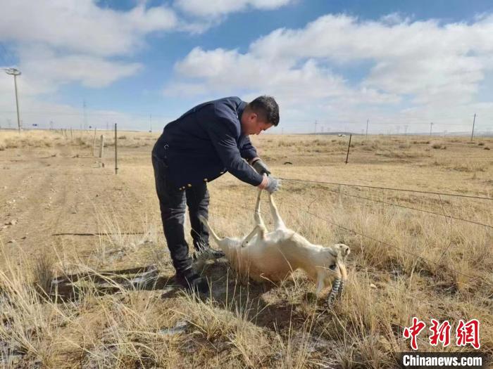 據(jù)介紹,3月12日11時許,青藏集團(tuán)公司西寧電務(wù)段哈爾蓋信號車間哈爾蓋信號工區(qū)的3名職工在徒步前往管內(nèi)那仁中繼站檢修信號設(shè)備途中發(fā)現(xiàn),有動物掛在網(wǎng)圍欄,無法掙脫。