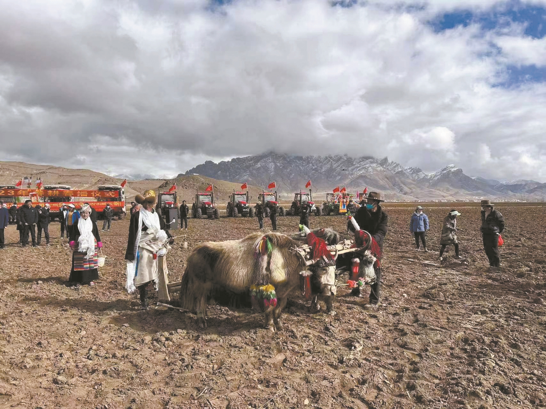 人勤春來早,功到秋華實。林周縣強嘎鄉(xiāng)強嘎村,一年一度盛大的春耕春播儀式正在進行。身著盛裝的農(nóng)牧民群眾,駕駛著一臺臺由國旗、彩旗、花束裝點的拖拉機,犁開沉寂了一冬的土地,將希望的種子撒向田野。明媚的春光里,雪域高原拉開春耕春播的帷幕。