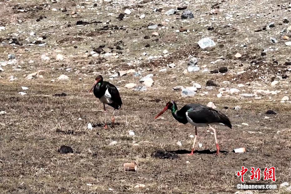 近日,攝影師在位于祁連山國家公園青海片區(qū)的青海省海北藏族自治州祁連縣阿柔鄉(xiāng)境內(nèi)拍攝到兩只黑鸛愜意覓食、翱翔。