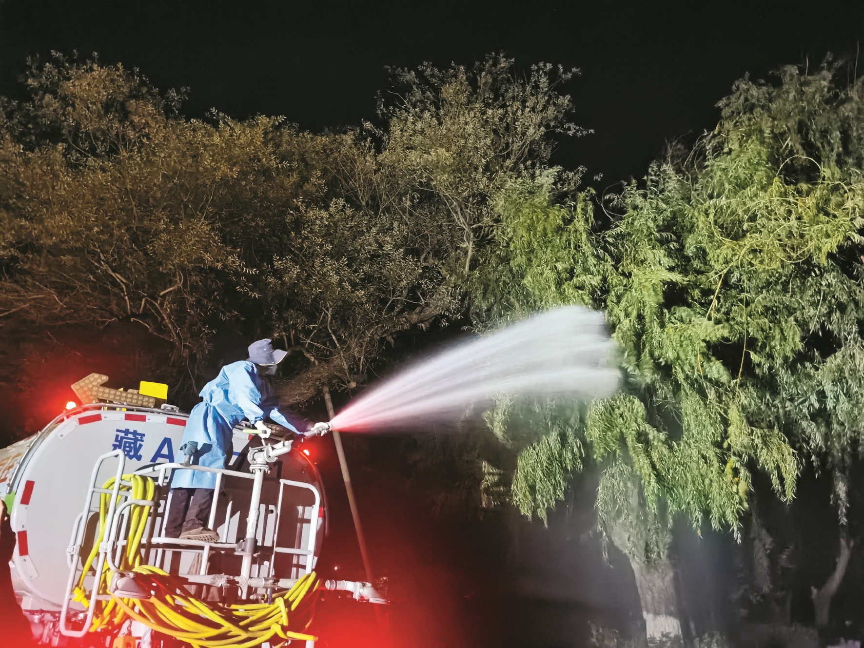 隨著夜幕降臨,羅布林卡公園內(nèi)市民游客逐漸散去,城關(guān)園林養(yǎng)護(hù)工人駕駛灑藥車開始入場(chǎng),準(zhǔn)備為園區(qū)內(nèi)的苗木進(jìn)行噴藥殺蟲作業(yè)。雨季過后,拉薩氣候較為干爽,為蟲害滋生提供了溫床,城關(guān)園林養(yǎng)護(hù)人員在前期排查發(fā)現(xiàn),羅布林卡公園廣場(chǎng)的苗木上有不同程度的柳葉蜂、柳大蚜蟲害現(xiàn)象。經(jīng)過技術(shù)人員的“把脈問診”,確定害蟲種類、生長(zhǎng)階段后,城關(guān)園林當(dāng)天組織兩輛大型灑藥車對(duì)園區(qū)進(jìn)行集中作業(yè),以預(yù)防大范圍的蟲害以及幼蟲化蛹越冬。