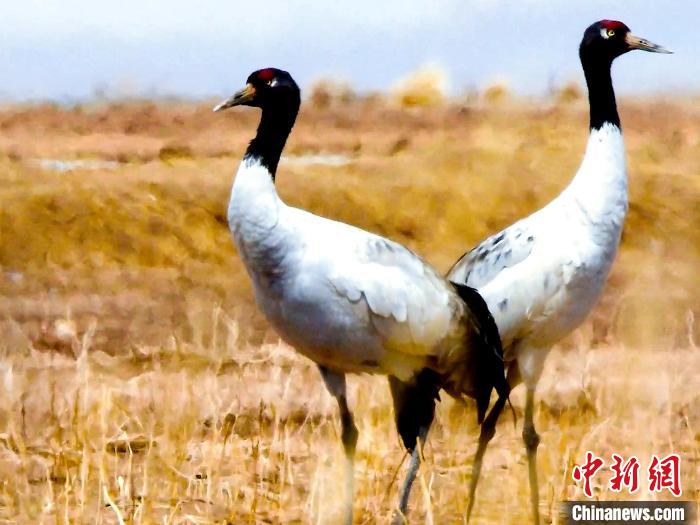 圖為黑頸鶴在草原駐足。才新木加 攝