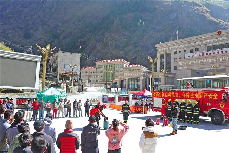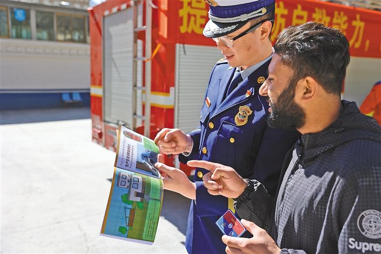 活動向入境外籍游客和商人發(fā)放了中文、英文、藏文三種語言的消防宣傳資料,用英語向外籍游客和商人講解、演示滅火器材使用方法、常見火災(zāi)預(yù)防措施、火場逃生和急救常識等,并組織干粉滅火器實操、液化石油氣火災(zāi)處置和疏散逃生演練。