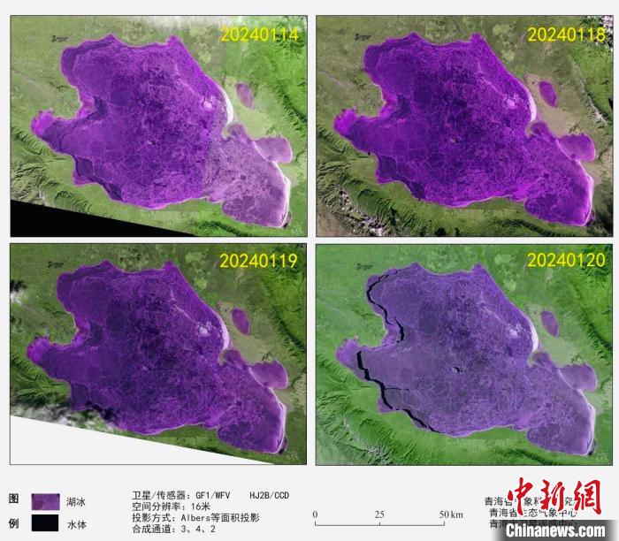據(jù)介紹,衛(wèi)星遙感監(jiān)測顯示,1月14日、18日、19日,青海湖湖泊表面完全凍結,依據(jù)《高原湖泊湖冰物候遙感監(jiān)測技術標準》(DB63/T1929-2021),湖泊表面連續(xù)5日完全被冰覆蓋的首日為完全凍結日,因此判定1月14日為青海湖完全凍結日。