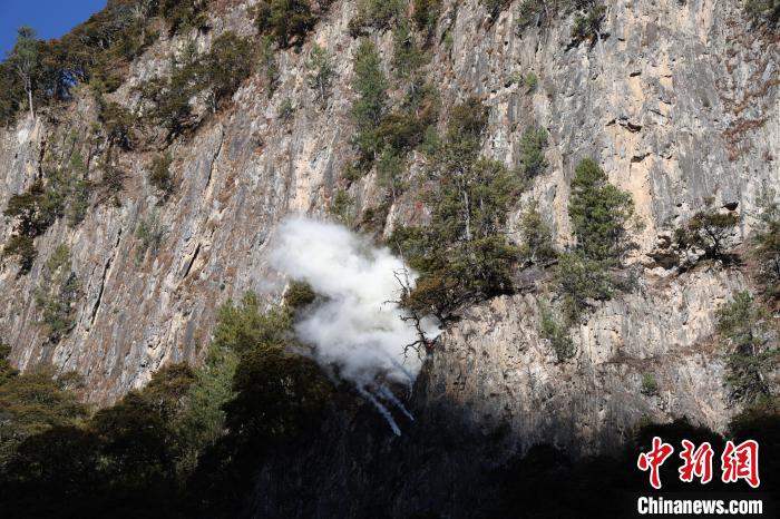 圖為演練現(xiàn)場(chǎng),無人機(jī)投彈撲打懸崖火。王澤棟 攝