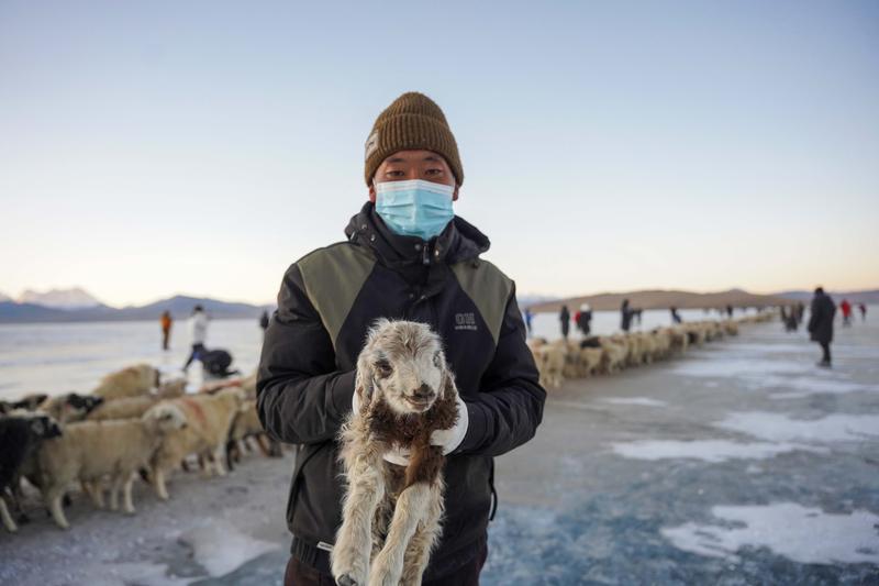 早上8點左右,趕羊正式開始。幾名牧羊人先行一步在冰面撒上爐灰,一名牧羊人抱著小羊踏上冰面,身后是羊群在冰湖上緩慢前行。還有兩名牧羊人牽著牧羊犬,與其他牧羊人一起分列兩側(cè),維持秩序。