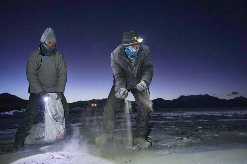 2月1日凌晨5點,記者從浪卡子縣趕往推瓦村。村口停放的小貨車里,整齊地堆放著裝有爐灰的麻袋。村民旺堆告訴記者,冬季里,推瓦村草場不能為羊群提供充足的牧草,而普莫雍措湖心島有著豐茂的水草。因此,在普莫雍措結(jié)冰期,村民們會將羊群趕到湖心島,湖面解凍前再把羊群趕回村里。