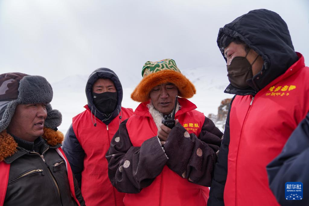瑪曲鄉(xiāng)長江源黨員環(huán)保志愿隊年近七旬的才嘎老人(左二)在巡邏守護(hù)長江源(2024年2月2日攝)。新華社記者 晉美多吉 攝