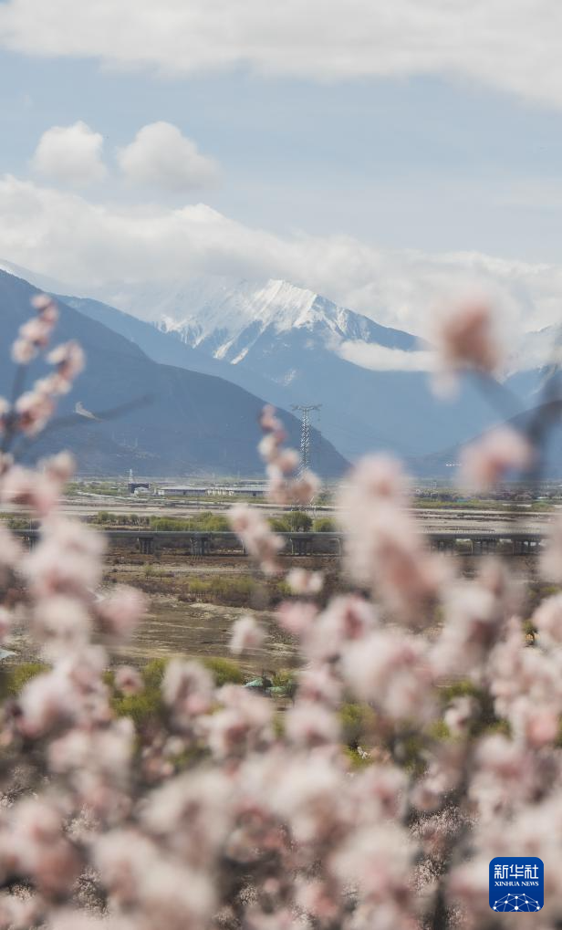 燦若云霞的桃花和潔白無瑕的雪山交織成一幅獨(dú)特的雪域高原美景(3月30日攝)。新華社記者 丁增尼達(dá) 攝