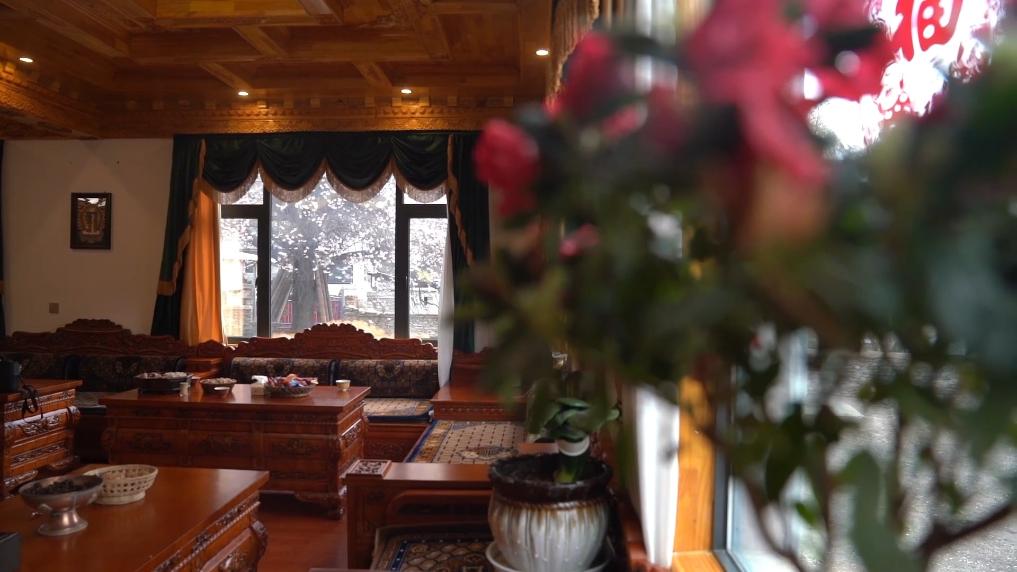 下午4點(diǎn),林芝市波密縣傾多鎮(zhèn)古通村,遠(yuǎn)來的游客入住到村民洛松頓珠開辦的民宿。寬敞的客廳里,藏式家具整齊大氣,窗外古老的桃花樹隨風(fēng)散落著陣陣花雨。