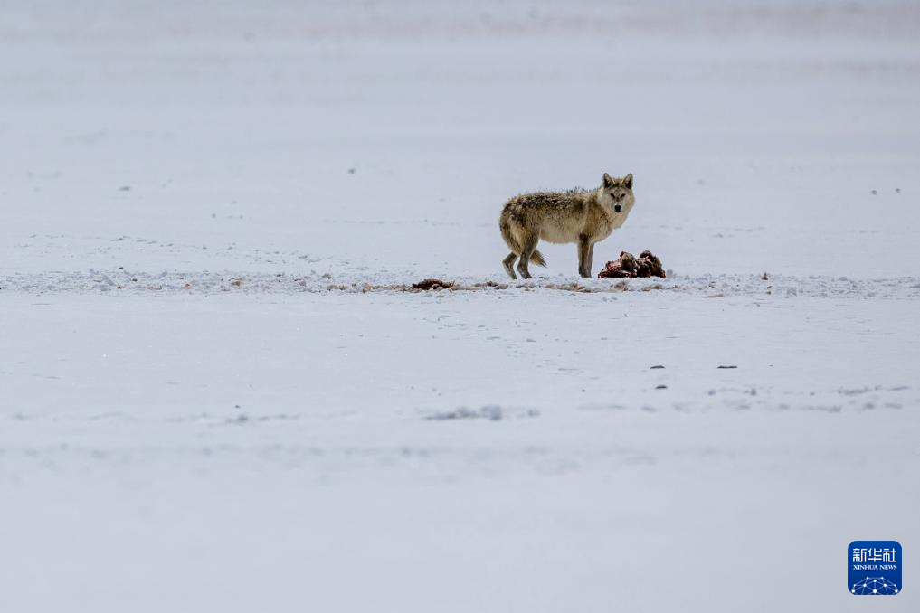在西藏那曲市尼瑪縣境內(nèi)的羌塘國(guó)家級(jí)自然保護(hù)區(qū)核心區(qū),一只狼在進(jìn)食(5月9日攝)。新華社記者 姜帆 攝