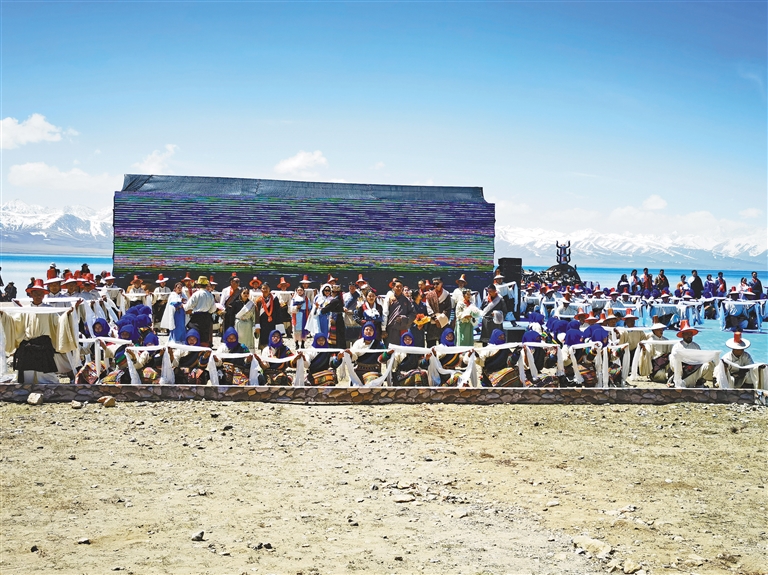 由300名演員將象征平安、吉祥的馬、牦牛、牛角、五彩哈達(dá)等元素融入表演全過程,藝術(shù)地展現(xiàn)獨有的開湖祈福場景。