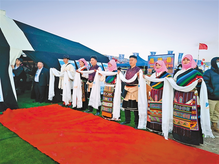 圖為當地群眾身著盛裝,手捧哈達,喜迎來客。