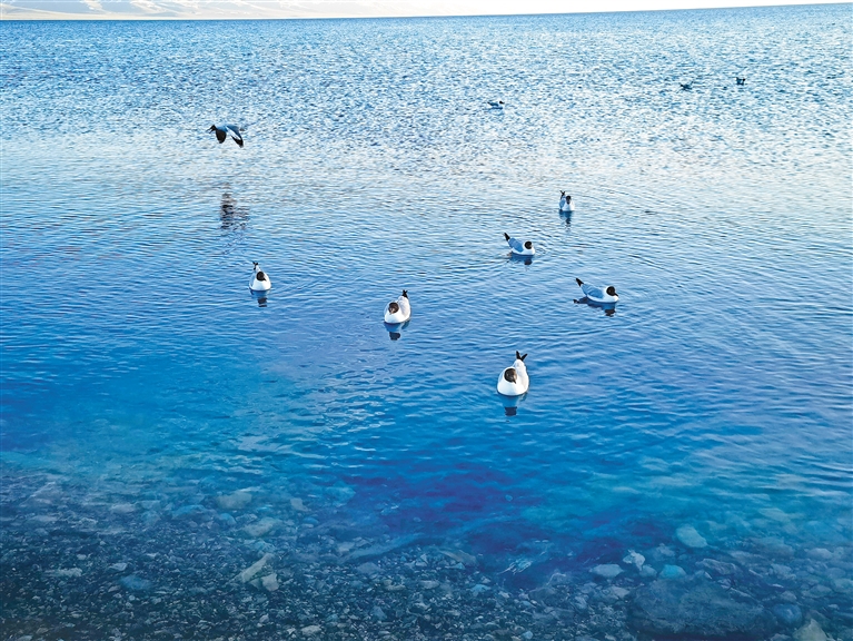 山與水相擁而生,文與旅相融而興。5月18日傍晚,在納木錯,遠遠望去,蔚藍遼闊的湖面與天際連成一線,清澈的湖水與遠處的念青唐古拉山相互輝映、水天一色,湖水輕柔地拍打岸邊砂石,一群棕頭鷗在消逝的湖面上嬉戲玩鬧,邀請游客共賞這絕美的視覺盛宴。