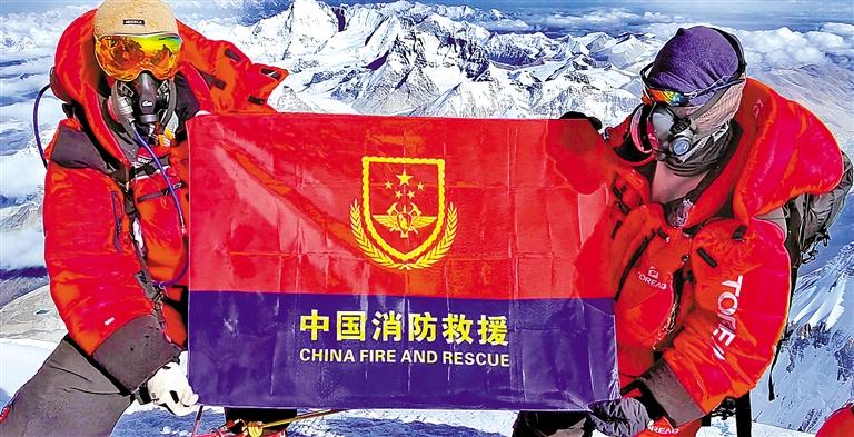 5月21日,西藏圣山高山救援隊(duì)隊(duì)員攜帶中國消防救援隊(duì)隊(duì)旗成功登頂珠峰并展示隊(duì)旗。(圖片由西藏消防救援總隊(duì)提供)