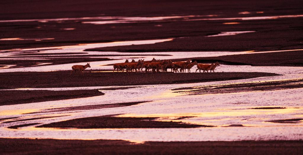 6月13日傍晚,在羌塘國家級(jí)自然保護(hù)區(qū),遷徙中的母藏羚羊越過甜水河。