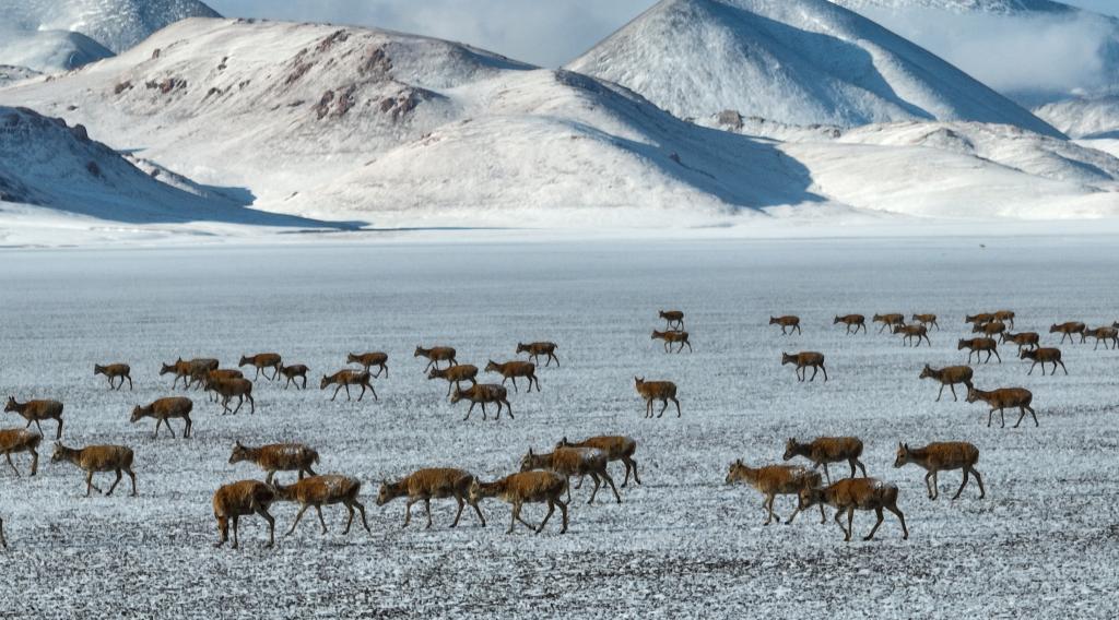 這是在甜水河畔荒灘雪地中向產(chǎn)羔地遷徙的藏羚羊(6月15日攝 無人機照片)。新華社記者 晉美多吉 攝