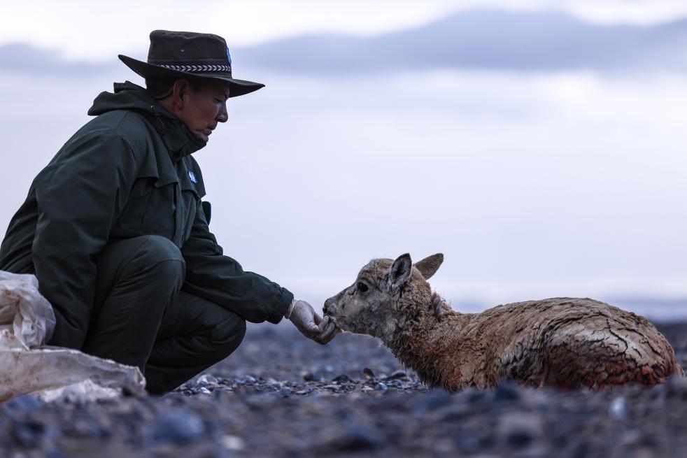 羅布嫻熟地用酒精清潔創(chuàng)面,手持針線慢慢地縫合她的肚皮——這場手術(shù)進行了50分鐘,母藏羚羊漸漸可以動了,她用鼻尖蹭了一下羅布的手,掙扎著起身,緩緩往東走去——那里是產(chǎn)羔地。