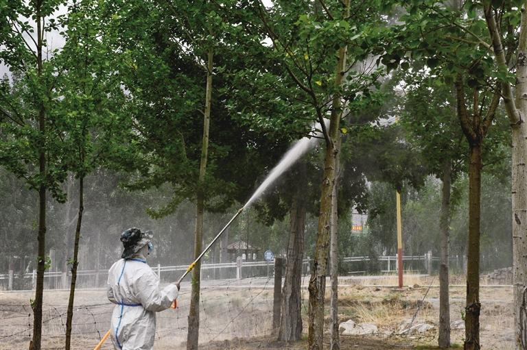 病因找到了,如何對癥下藥才是關(guān)鍵。防治隊將整片楊樹林分成三個區(qū)域,首先伐掉干死腐爛的樹,其次對病害區(qū)域進(jìn)行殺菌消毒?!懊總€區(qū)域我們噴灑的藥劑也不同,主要是想對防治效果進(jìn)行實驗。通過持續(xù)兩個月的觀察,發(fā)現(xiàn)第一組藥劑防治效果明顯,因此我們開始在整片楊樹林推廣第一組藥劑?!秉S敏說。
