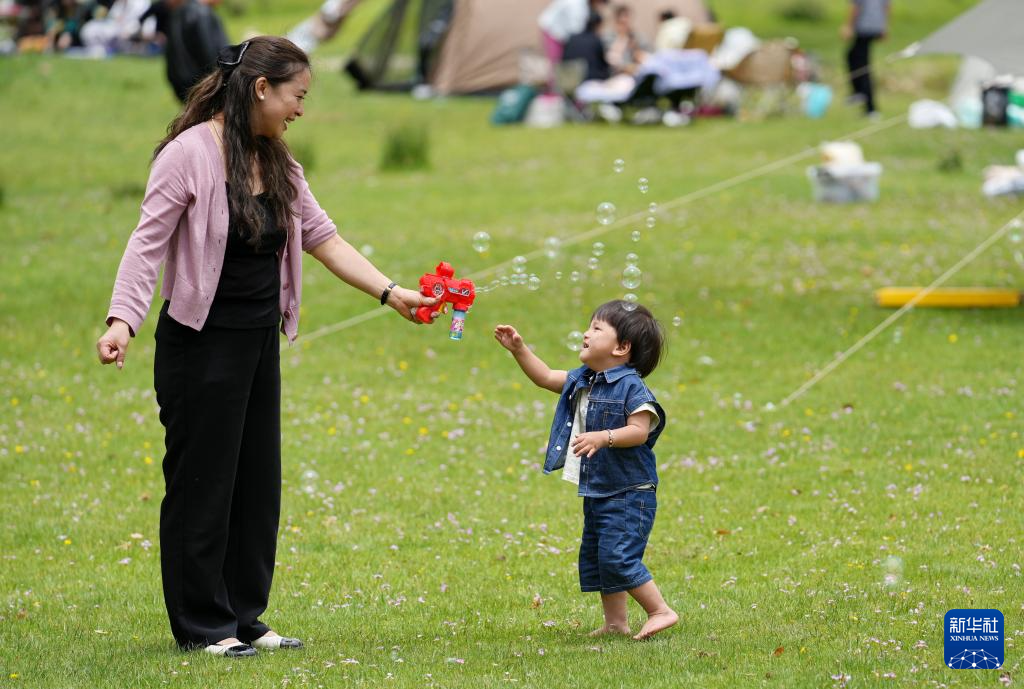 7月14日,家長和孩子在“神秘樹林”的草地上玩泡泡機(jī)。新華社記者 張汝鋒 攝