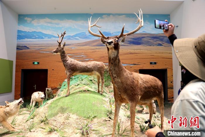 7月24日,參加“中國式現(xiàn)代化的萬千氣象·網(wǎng)絡(luò)名人青海行”活動(dòng)的網(wǎng)絡(luò)名人,抵達(dá)江河源頭青海玉樹藏族自治州,在玉樹州博物館一覽自然與人文之美。玉樹州博物館是玉樹地震災(zāi)后重建十大標(biāo)志性建筑之一,分為序廳、自然展區(qū)、人文展區(qū)、臨時(shí)展廳。其通過實(shí)物標(biāo)本等方式,展示了三江源和可可西里的野生動(dòng)物、草地、森林,以及玉樹州的歷史、建筑、服飾、飲食等。圖為玉樹州博物館內(nèi)的野生動(dòng)物展示。中新社記者 張?zhí)砀?攝