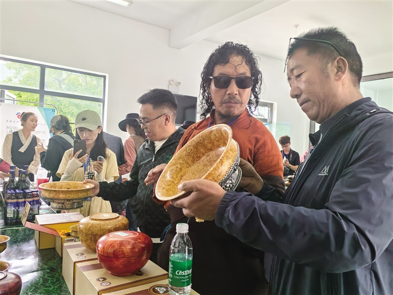 探訪團一行前往西藏山南加查達布傳統(tǒng)文化產(chǎn)業(yè)發(fā)展有限公司探訪加查木碗的制作技藝。在該公司的展廳內(nèi),西藏自治區(qū)級加查木碗非遺傳承人、公司負責人桑珠向探訪團詳細講解了加查木碗從選材、切割、打磨到雕刻的每一個制作環(huán)節(jié)。桑珠拿起一個個造型各異、原材料不同的木碗向探訪團介紹著木碗的品質(zhì)分辨技巧、用處等。楊樹、松樹、柏樹……一塊塊承載著歲月的木頭,經(jīng)過木匠們的一道道復雜的工序后,變成了精美的藝術(shù)品?!斑@種碗面像圓珠筆點涂的是上等木料制成的精品,最低售賣價值可達到4000元一個?!鄙V檎f,“現(xiàn)在來買木碗的人越來越多,很多游客也會買回去當伴手禮。這讓我更加堅定了傳承和發(fā)展這項技藝的決心?!?/p>