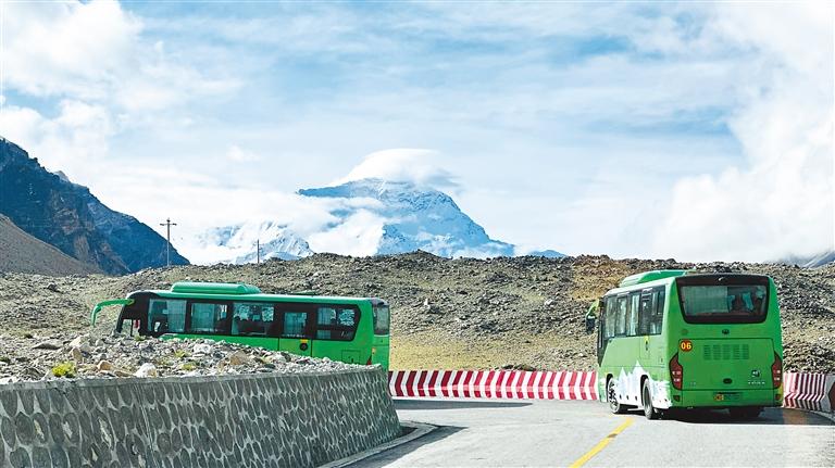 圖為載滿(mǎn)游客的清潔能源環(huán)??蛙?chē)前往珠峰大本營(yíng)。記者 格桑倫珠 攝