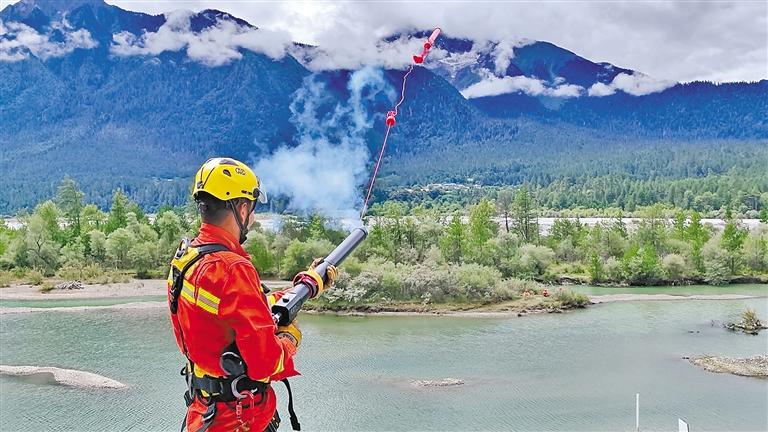 圖為波密縣森林消防中隊隊員在用拋繩器拋繩。記者 張宇 攝