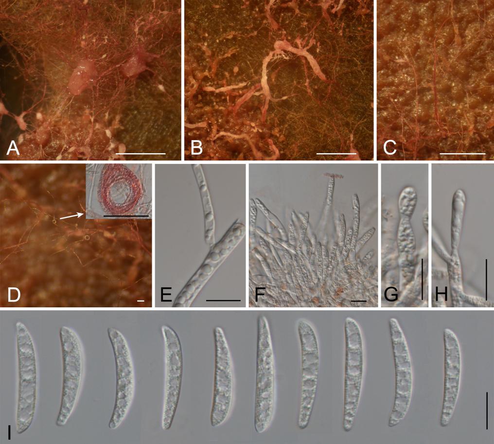 西藏梭孢菌的形態(tài)。A、B:PDA上形成的分生孢子團,C:紅色的菌絲,D:菌絲結環(huán),E:透明的菌絲,F(xiàn)-H:產孢細胞及初生的分生孢子,I:分生孢子。標尺A-C=500μm;D=50μm;E-I=10μm。(西藏自治區(qū)生態(tài)環(huán)境廳供圖)
