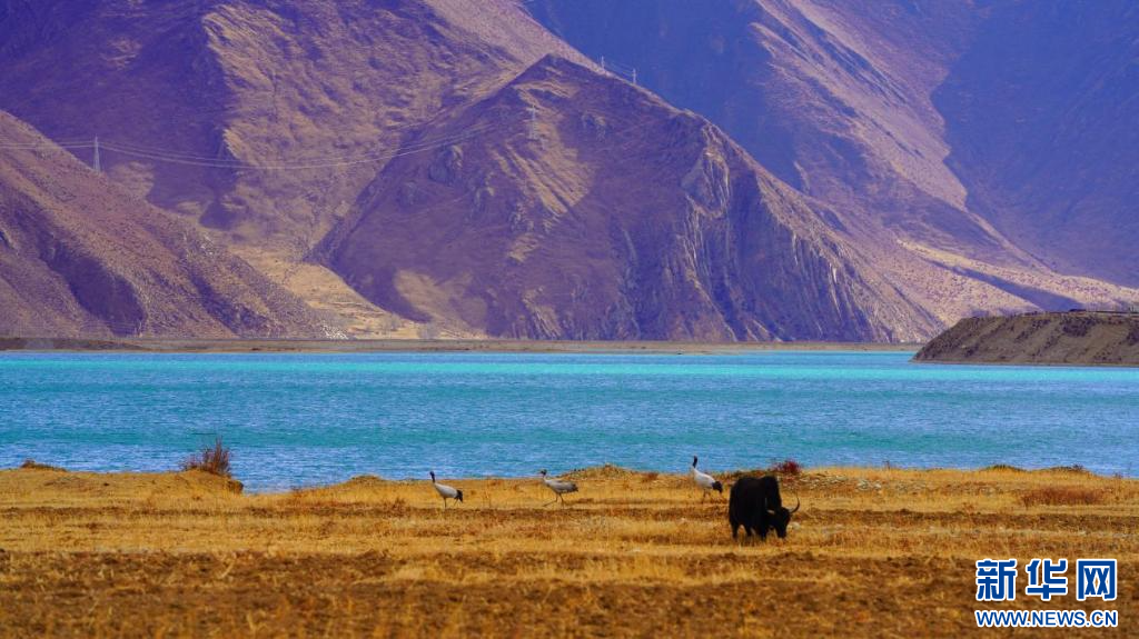 圖為湖邊的黑頸鶴與牦牛(11月24日攝)。新華網(wǎng)發(fā) 嘎色攝