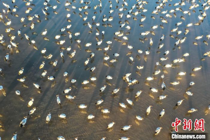 11月27日晨,西藏自治區(qū)拉薩市林周縣黑頸鶴保護區(qū)內(nèi),大量越冬的黑頸鶴在虎頭山水庫覓食、嬉戲。林周縣位于拉薩河上游及澎波河流域,平均海拔約4200米,是黑頸鶴的主要越冬地之一。(無人機照片)中新社記者 貢嘎來松 攝