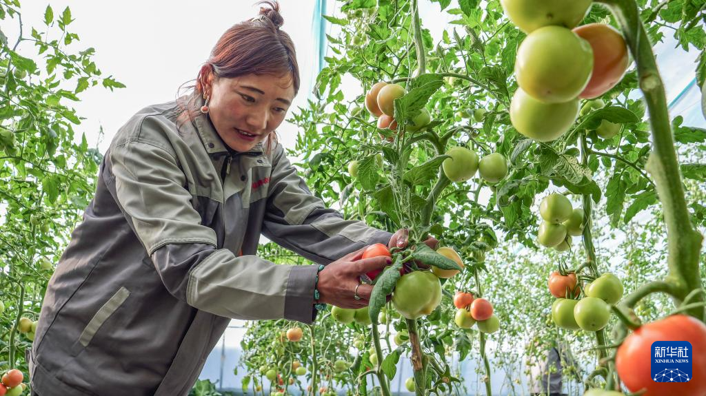 11月22日,在丁青縣農業(yè)生態(tài)產業(yè)園,工作人員在采摘西紅柿。新華社記者 格桑朗杰 攝