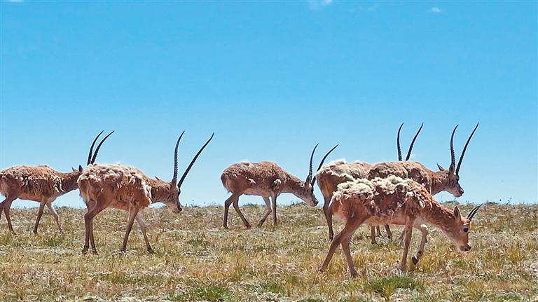 天邊泛起魚(yú)肚白,掛著露珠的草尖在陽(yáng)光下微微泛著金光,青藏公路旁,藏羚羊母親低頭吃草,出生才一個(gè)多月的藏羚羊?qū)殞毾駛€(gè)頑皮的孩子,圍著母親一會(huì)跑、一會(huì)跳,望著轟鳴的火車(chē)、呼嘯的汽車(chē),眼睛里充滿(mǎn)著好奇。