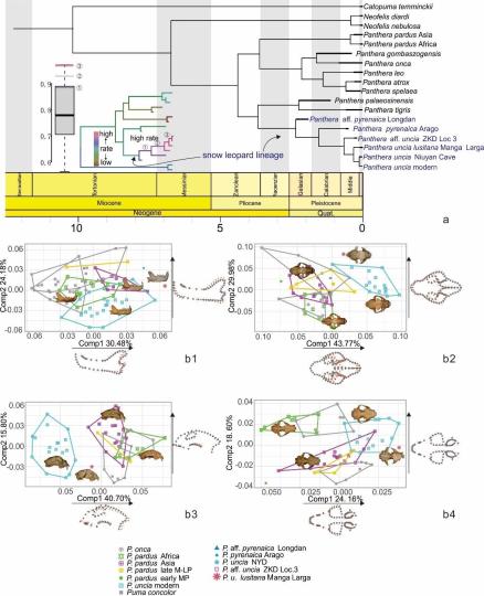 由于青藏高原地區(qū)化石相對(duì)稀疏,第四紀(jì)(約260萬(wàn)前至今)以來(lái)的記錄尤為稀少,雪豹是如何逐步演化出如今特化適應(yīng)青藏高原的模樣仍然不明。分子生物學(xué)的研究支持雪豹現(xiàn)生親緣關(guān)系最近的物種是虎,但雪豹和虎的形態(tài)及生態(tài)適應(yīng)都截然不同,僅僅依靠分子生物學(xué)解決不了雪豹是如何特化的問(wèn)題。